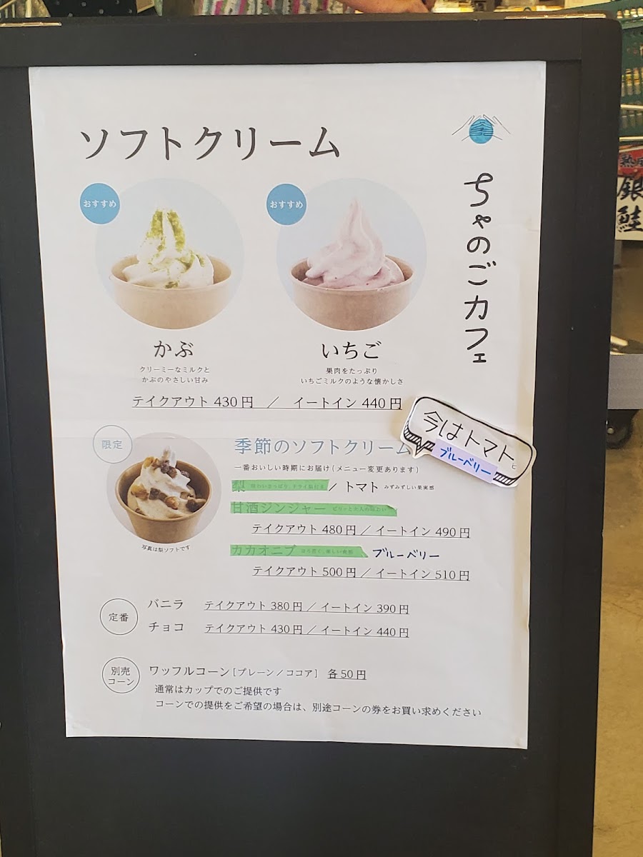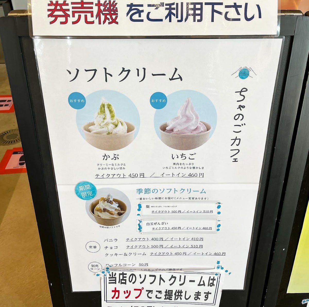 The menu is a lovely selection of comforting drinks and delectable soft-serve ice creams. The true highlight? You must try the kabu (turnip) soft serve, which is unique to this area and made using finely grated kabu. Customers rave about its milky, sweet profile intricately blended with a subtle earthy flavor from the turnip. A delightful scoop is served at 440 yen for dining in or 430 yen for takeout, making it not just a treat but also a charming curiosity worth experiencing.